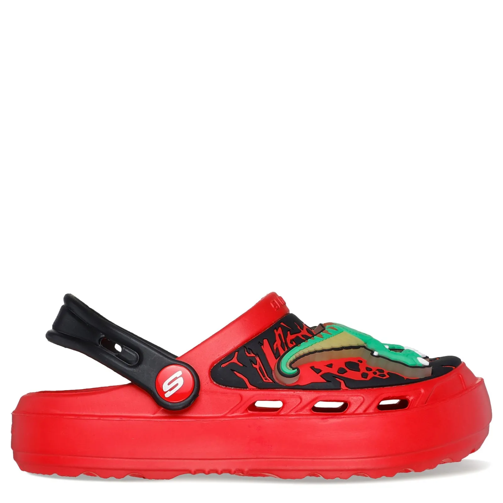 He will experience roaring fun and comfort with the Skechers Foamies: Swifters – T-Rex-Brights clogs. Featuring a flexible EVA upper with a playful dino-themed design, convertible heel strap, and lighted details, these clogs offer contoured cushioning for all-day wearability and a flexible traction outsole for added stability.