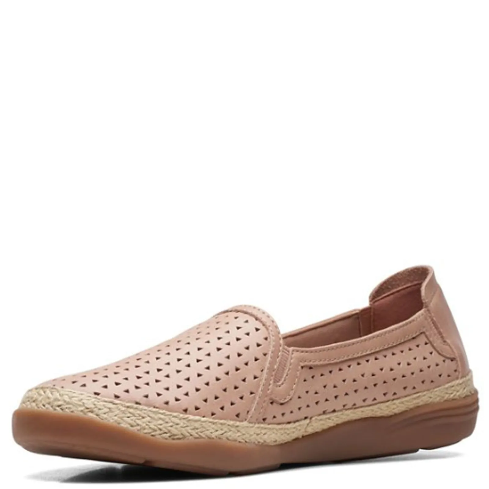The Clarks Elaina Ruby espadrille is a charming perforated leather slip-on that keeps you comfy all day long. With braided jute trim around the top of the midsole and memory foam footbed, you’ll want to wear this shoe all the time Perforated leather uppers with braided jute trim Slip on style for easy on and off with elastic gore panels for flexibility Cushioned Memory Foam insole Brushed fabric lining Manmade TPR outsole is flexible and lightweight
