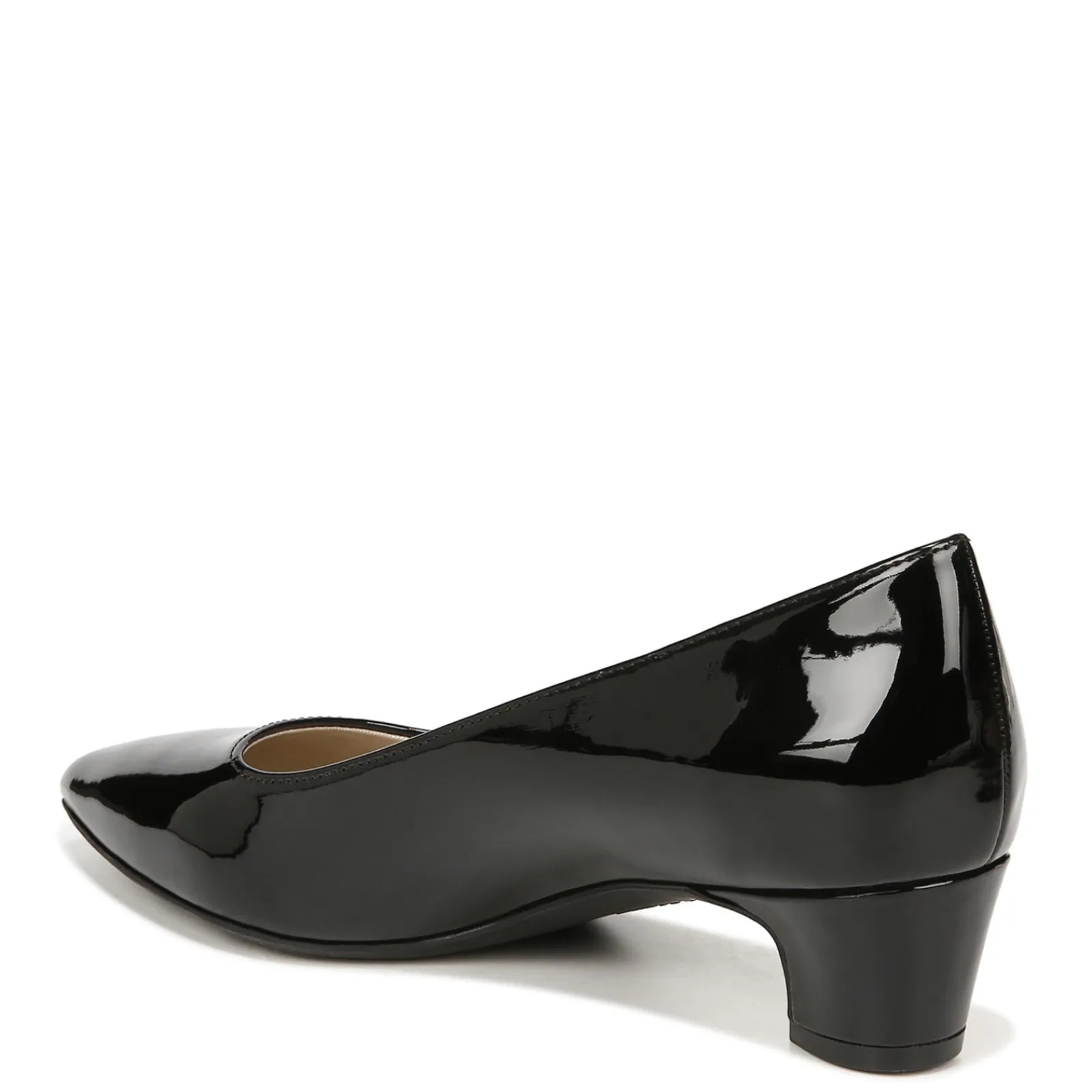 - Faux leather uppers in a low heel pump style