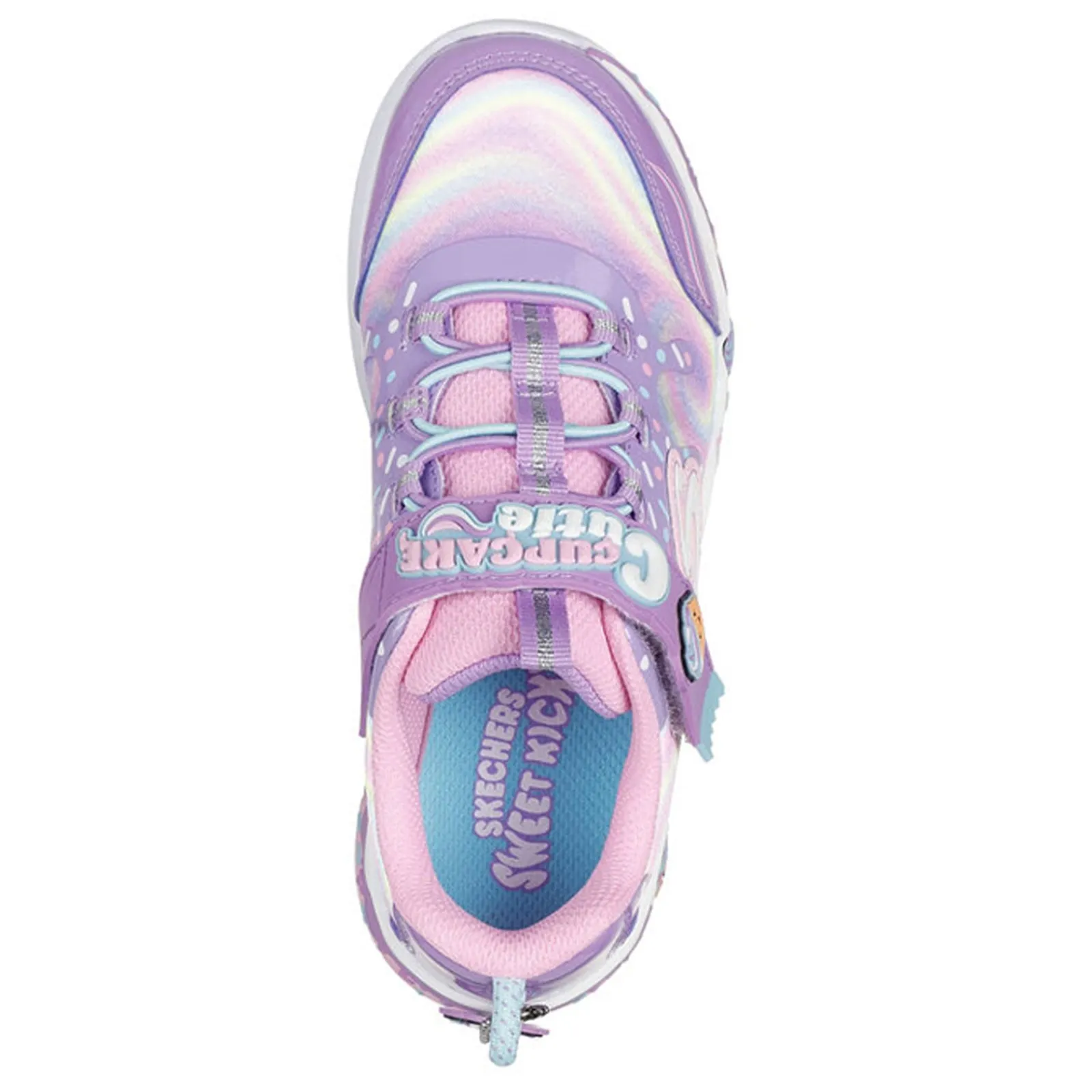 Treat her feet to a playful delight with Skechers Sweet Kickz: Cupcake Cutie. This adorable cupcake-themed scented sneaker features a swirl-printed synthetic upper, stretch laces, Skechers Adaptive Closure, a detachable heel charm, and a cushioned comfort insole.