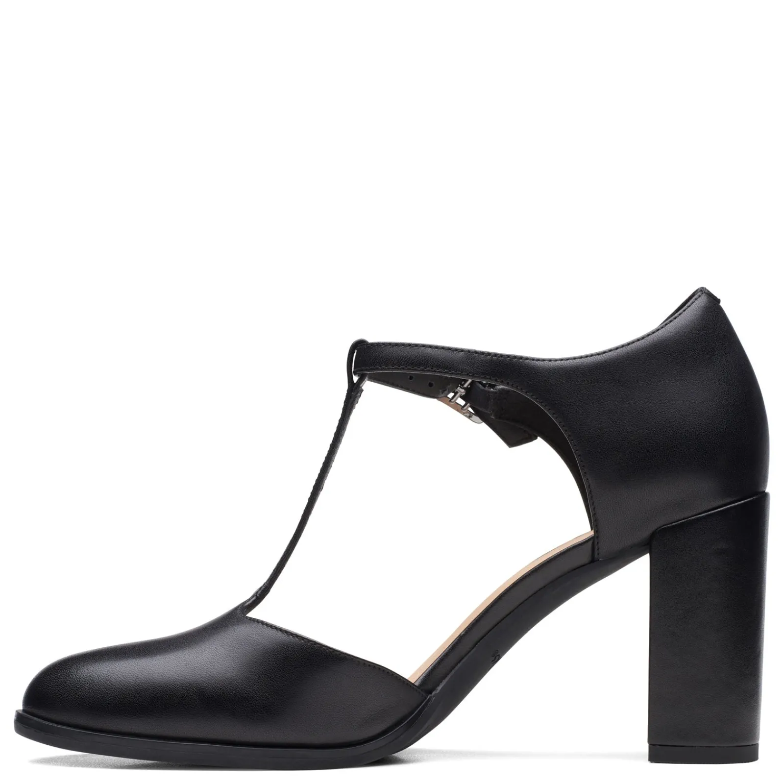 Women’s Clarks, Freva 85 Bar Pump Classically inspired and beautifully crafted, our Freva 85 Bar Mary Jane pump will always be in fashion. Pair it with tailored trousers and a button-down blouse to add a timeless finishing touch to your office ensemble Responsibly sourced premium leather upper Leather lining and sock offer a luxurious feel T-strap design with adjustable ankle strap Contour Cushion footbed with added arch support Rubber outsole3 1/3-inch block heel