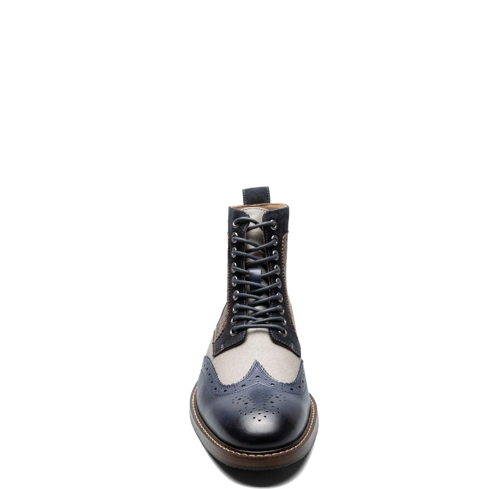 Men’s Stacy Adams, Finnegan Wingtip Lace Up Boot. If you love contrasts and bold, modern design, then you will appreciate the Finnegan Wingtip boot. It’s tumbled leather upper pairs perfectly with its waxy canvas perforated panel and stacked heel. A Memory Foam insole and durable rubber outsole set this boot apart from all other lace-up boots.