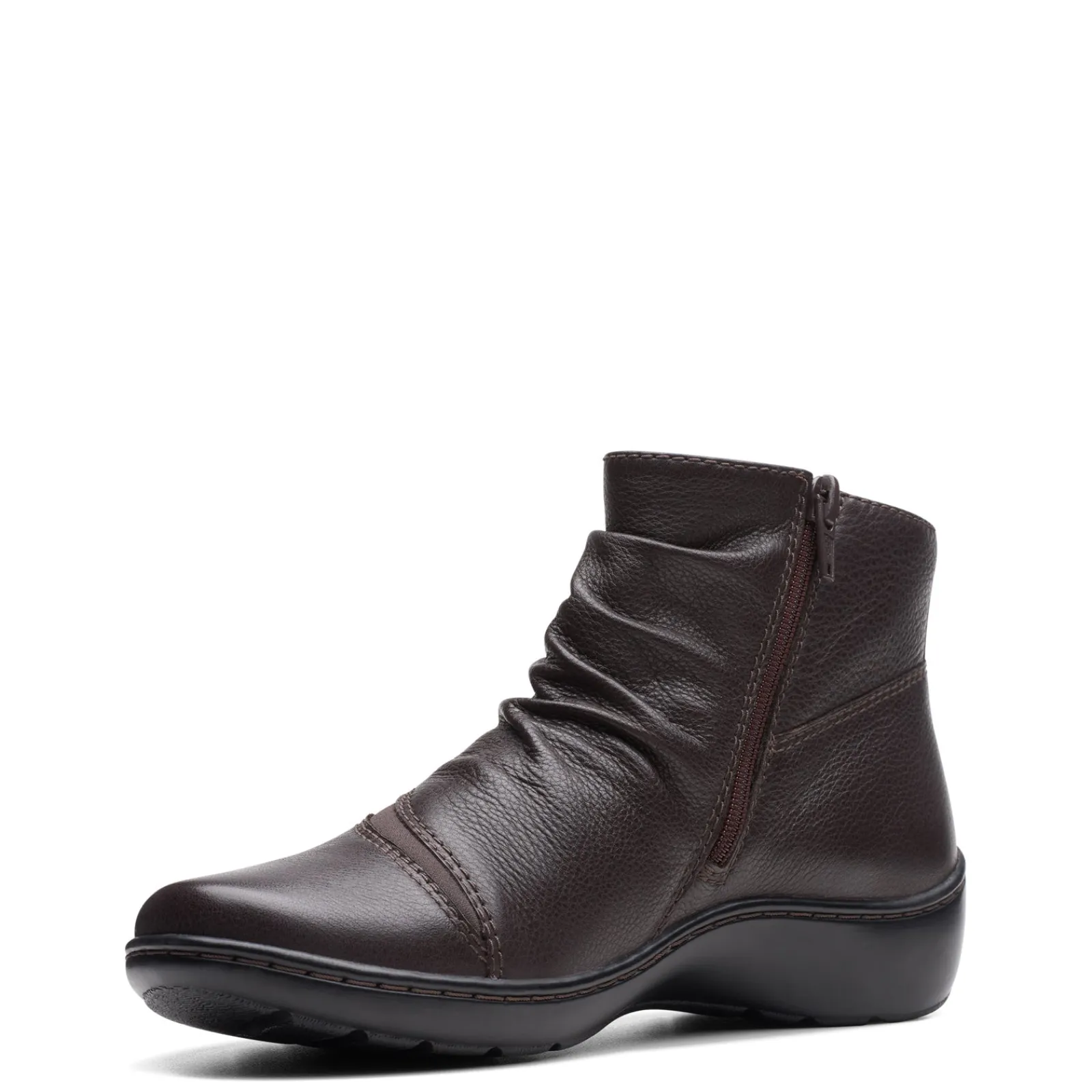Take a fashionable step this fall in the Cora Derby boot from Clarks. The beautifully crafted leather upper features a rouched detailing and a fabric panel for added interest.