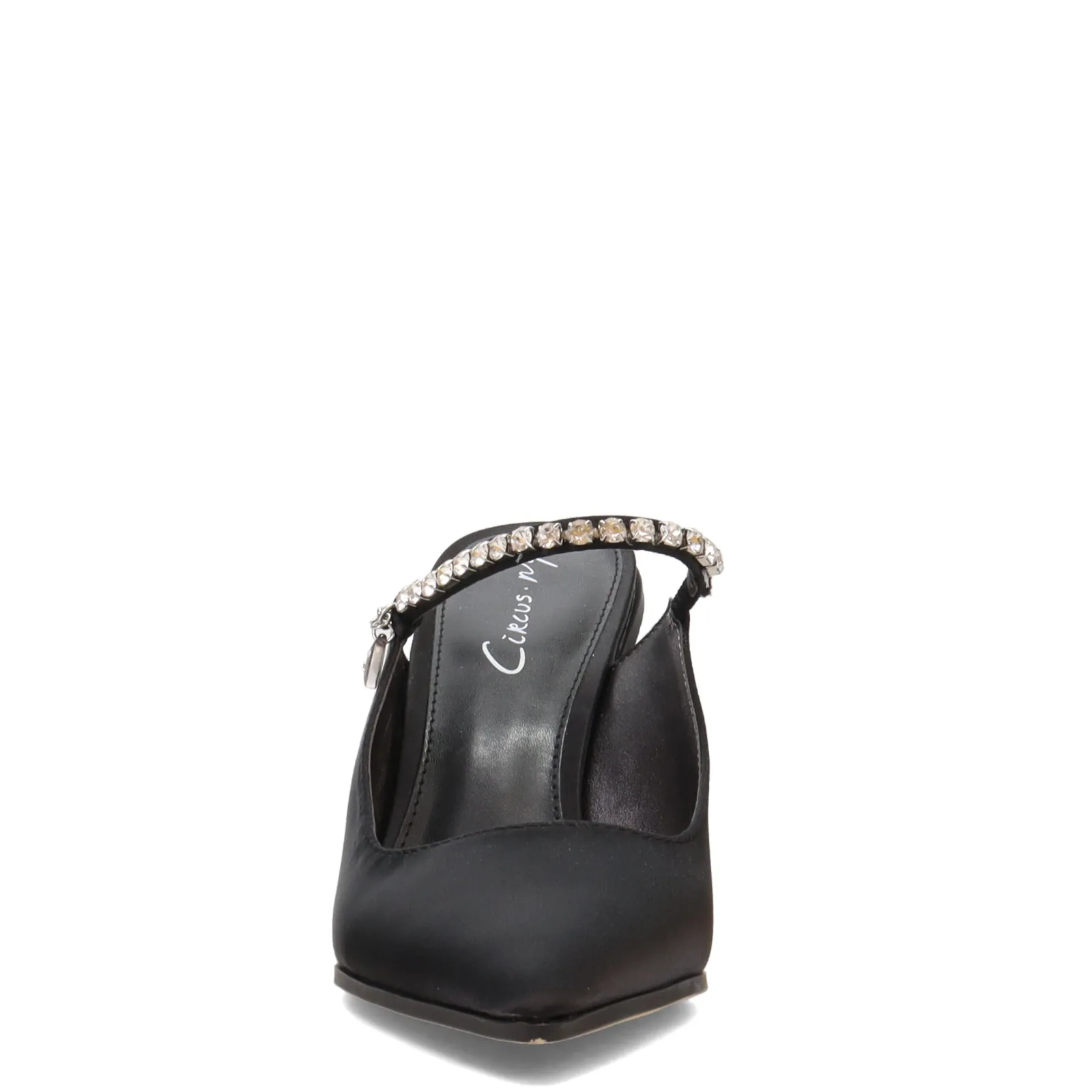 - Synthetic uppers with rhinestone strap in a pointed toe high heel pump