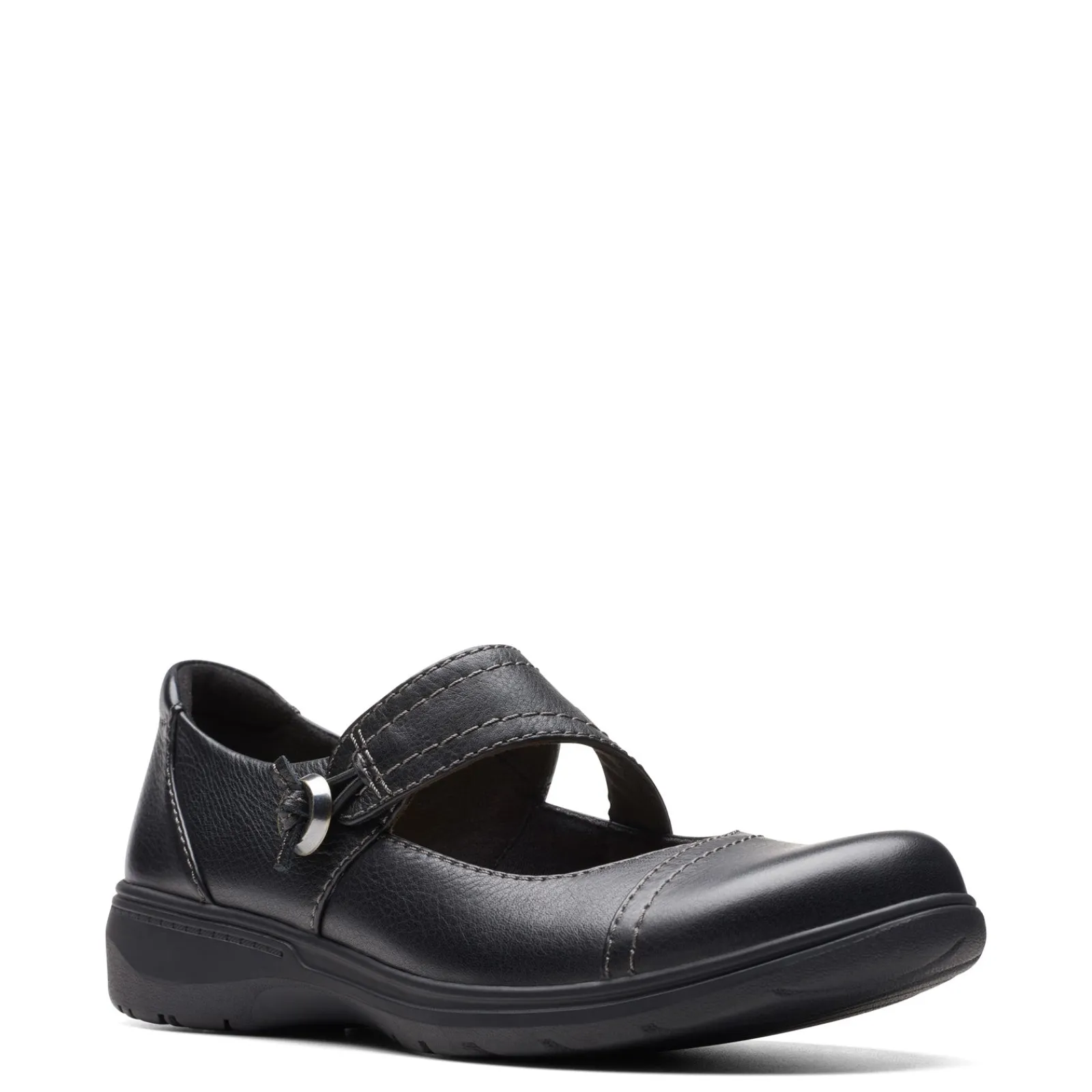 Pair the casual Clarks Carleigh Jane with your favorite jeans for a comfortable and cute look. This Mary Jane has smooth leather upper with button and accent stitch details, adjustable strap with hook-and-loop closure, textile linings, and an Ultimate Comfort footbed Smooth leather uppers with stitching accents Fabric linings Adjustable hook and loop instep strap for a secure fit Ultimate Comfort footbed TPR outsole is lightweight and flexible