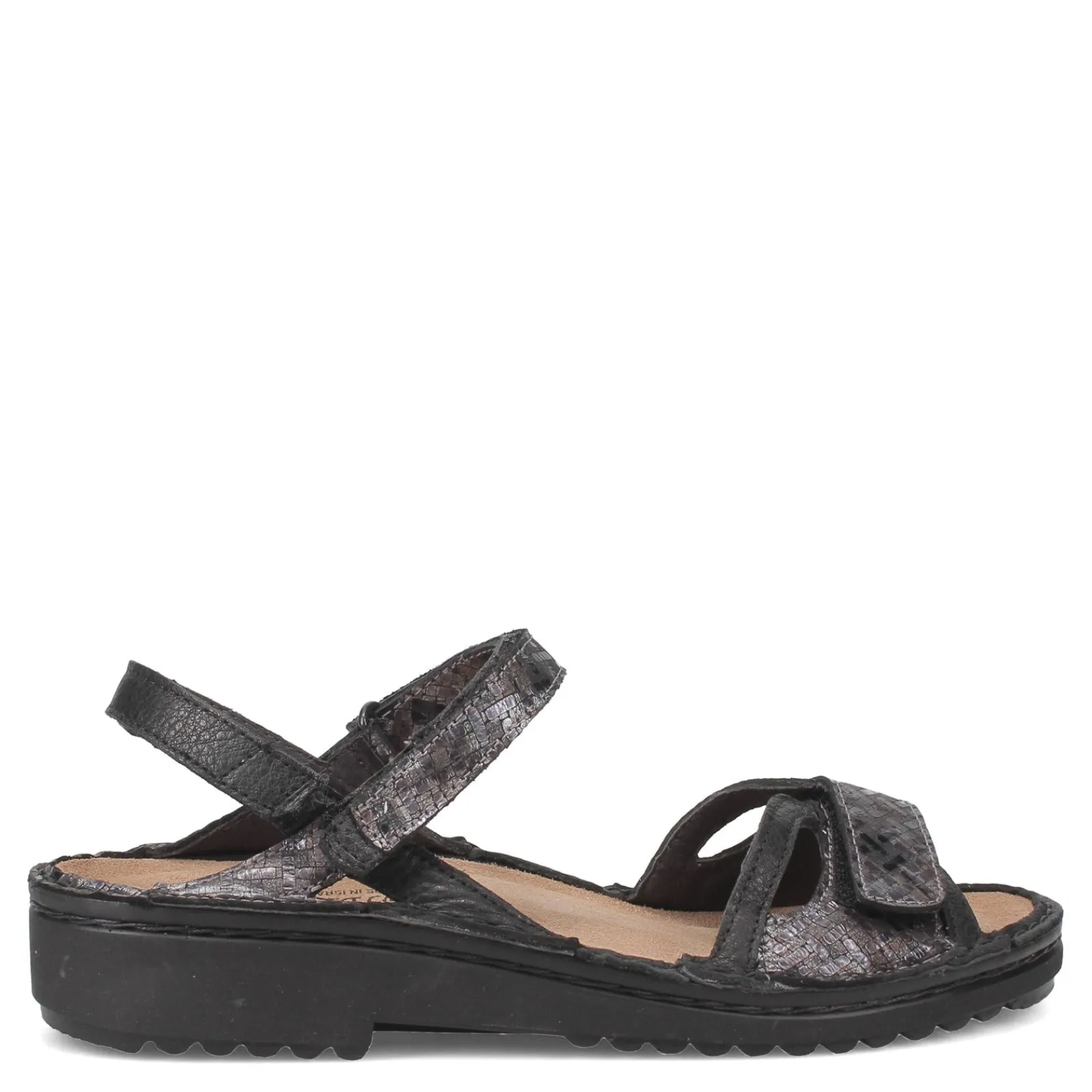 - Naot’s removable, suede wrapped anatomic cork and latex footbed is molds to the shape of the foot