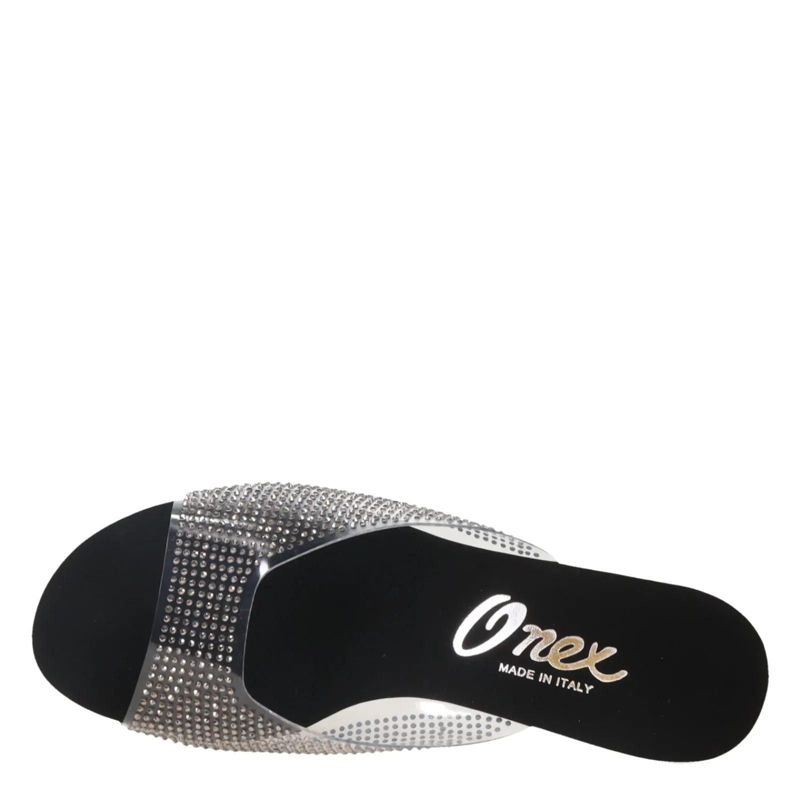 Crafted in Italy, these crystal-adorned slides make for an elegant addition to any evening wardrobe. The iridescent crystals reflect a spectrum of hues for a dazzling look