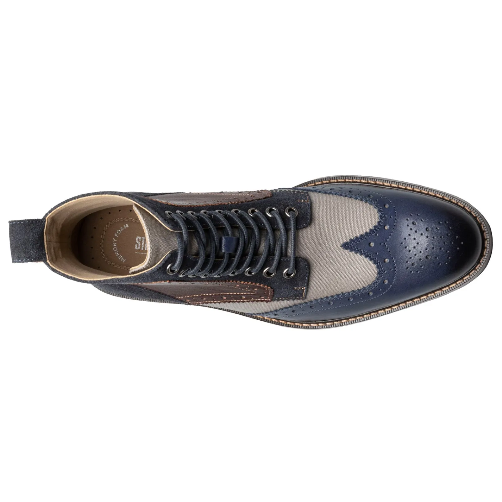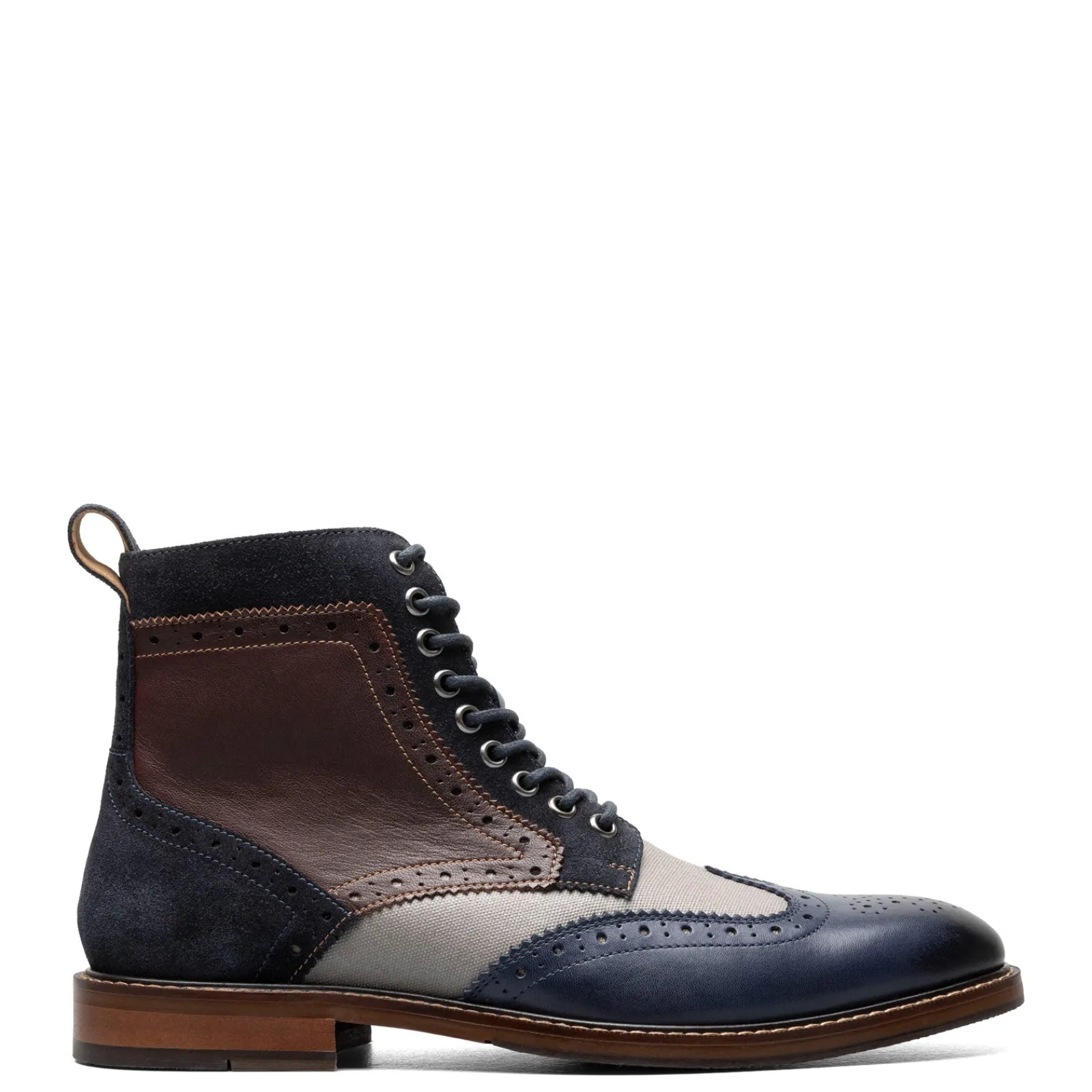 Men’s Stacy Adams, Finnegan Wingtip Lace Up Boot. If you love contrasts and bold, modern design, then you will appreciate the Finnegan Wingtip boot. It’s tumbled leather upper pairs perfectly with its waxy canvas perforated panel and stacked heel. A Memory Foam insole and durable rubber outsole set this boot apart from all other lace-up boots.
