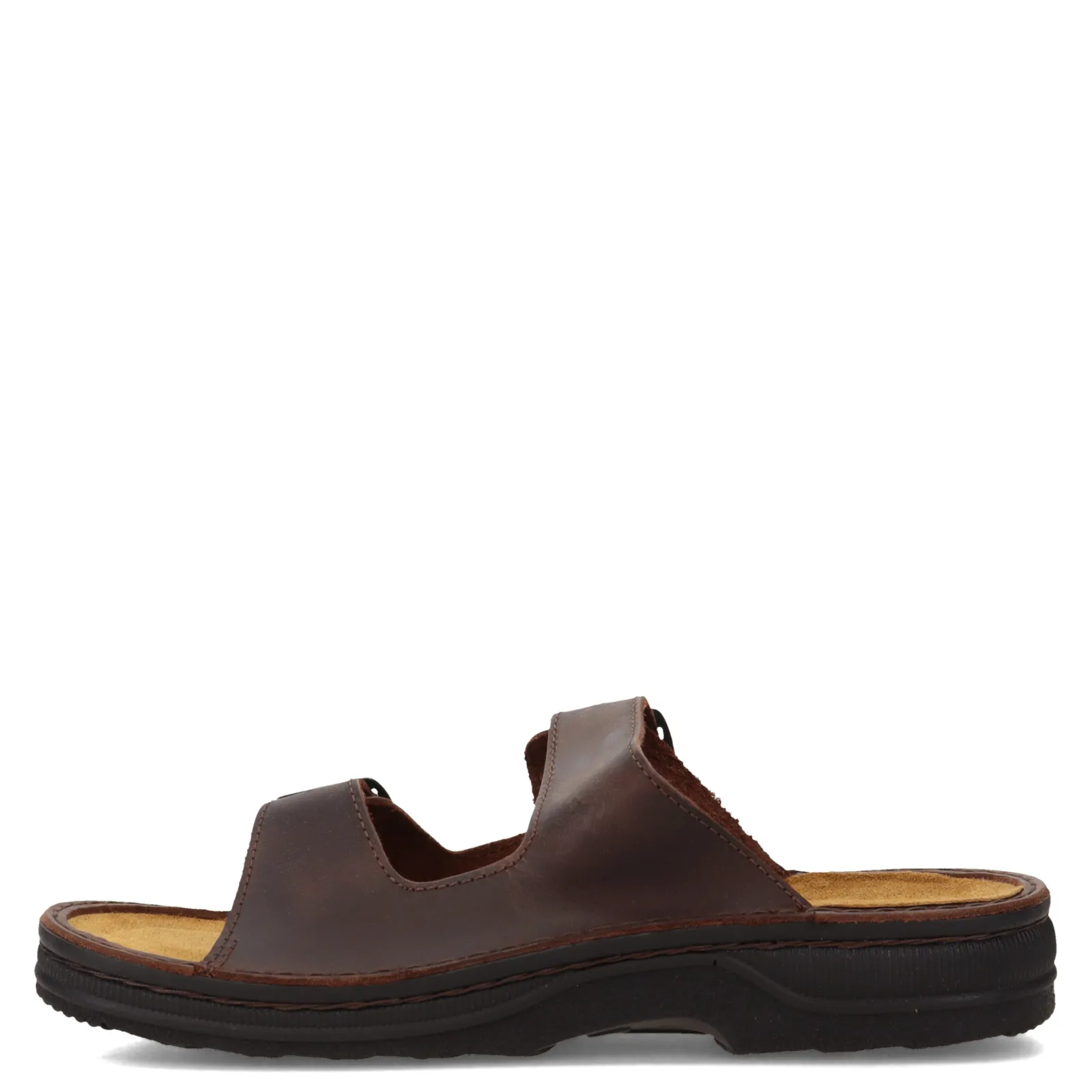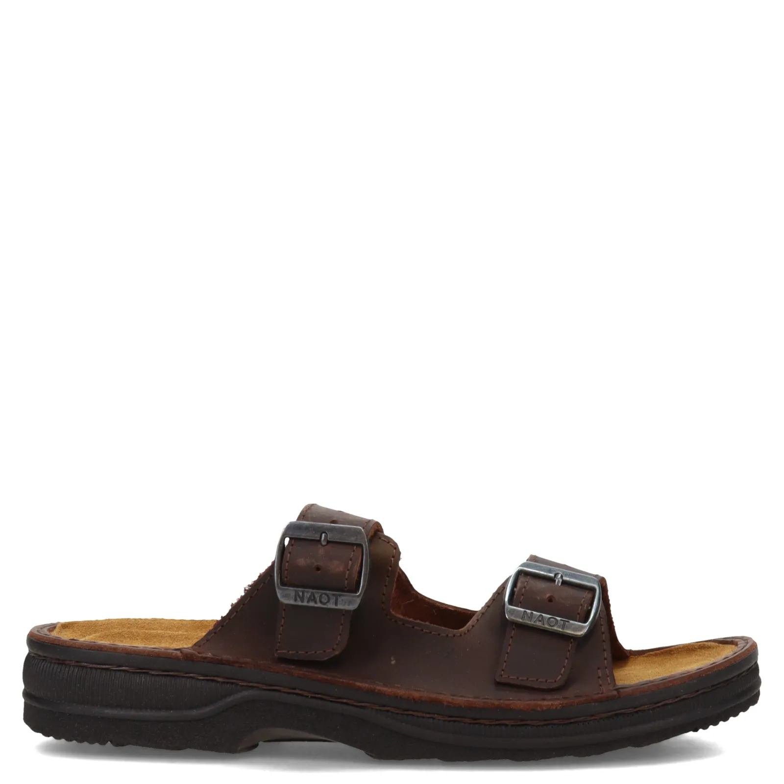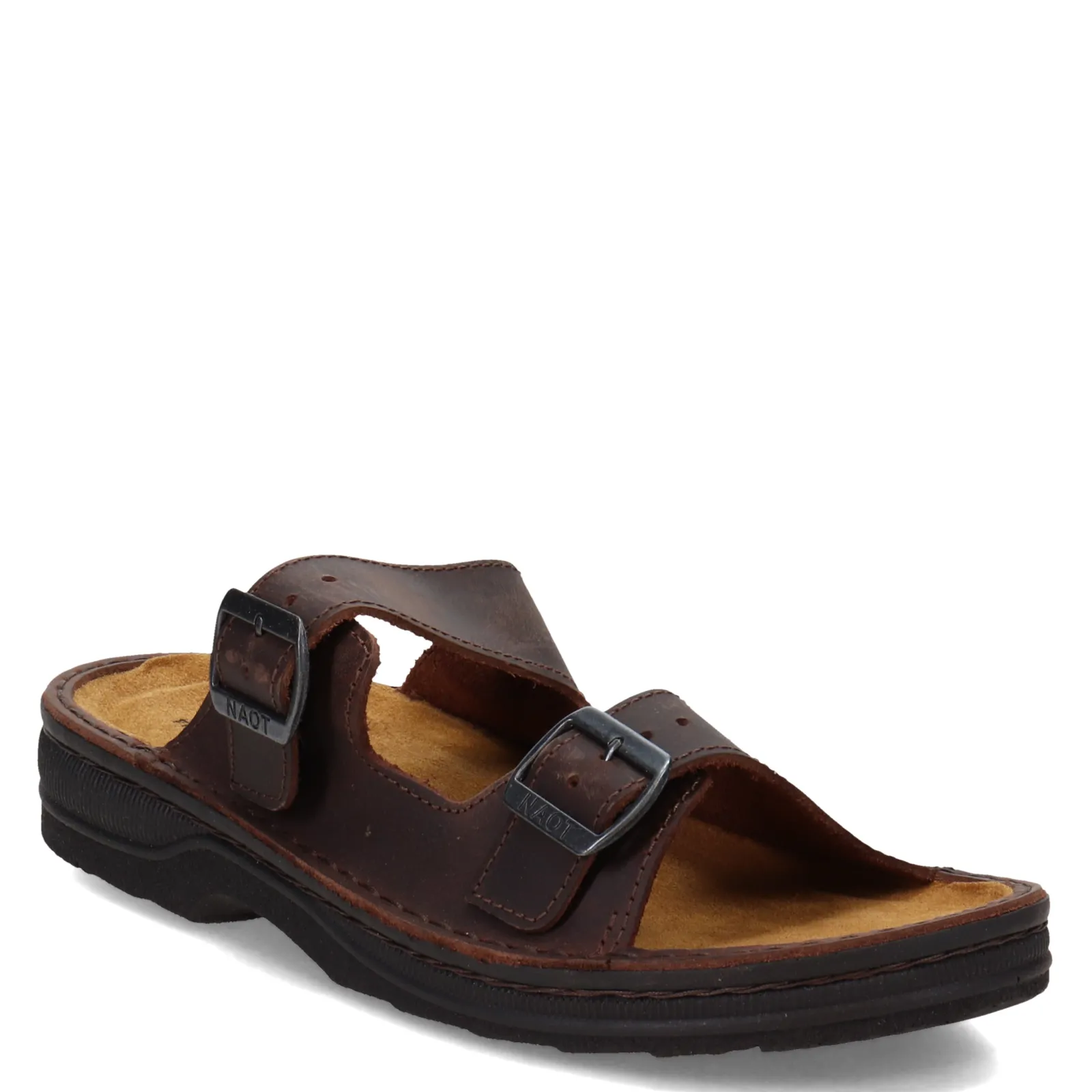 Men’s Naot, Mikael 2 Sandal. The Mikael is a completely adjustable slide with two buckle straps. The side panels on this style provide extra support. Naot’s removable, anatomic cork & latex footbed is wrapped in pampering suede and molds to the shape of the foot with wear.