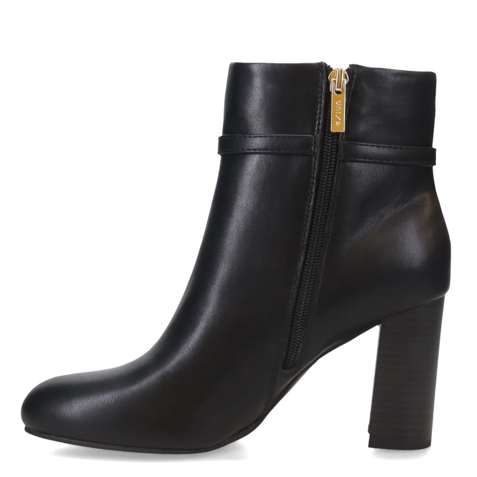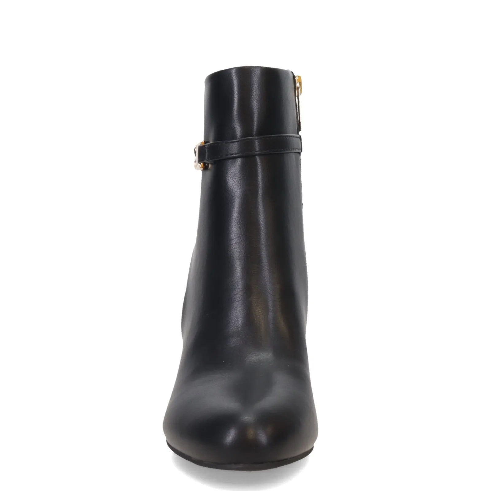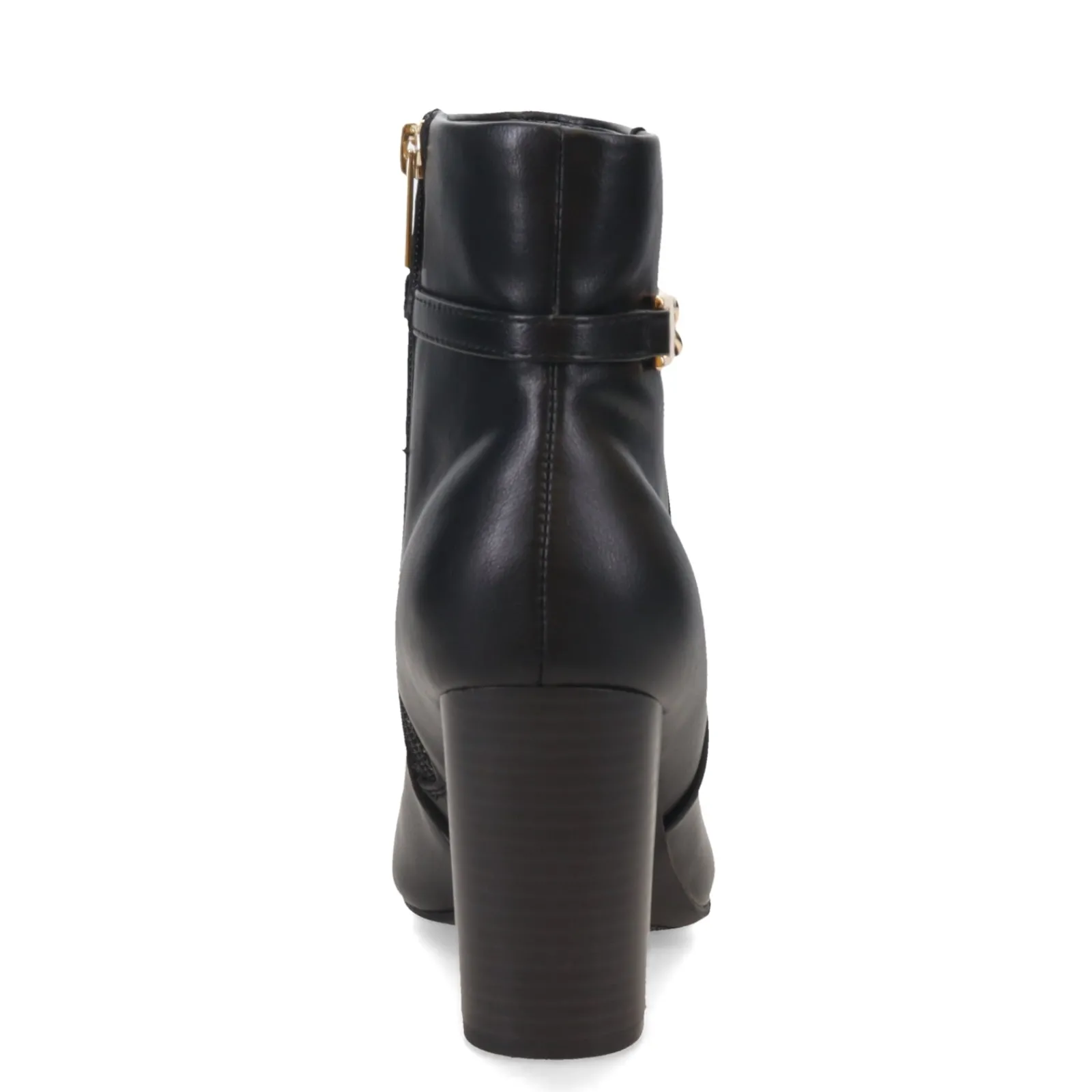 Be the girl with the most fashionable look in the room in this stacked heel boot. With a sleek faux leather upper and featuring classy buckle for extra appeal, this ankle boot has a lightly padded insole to comfort while the high stacked heel provides stable lift.