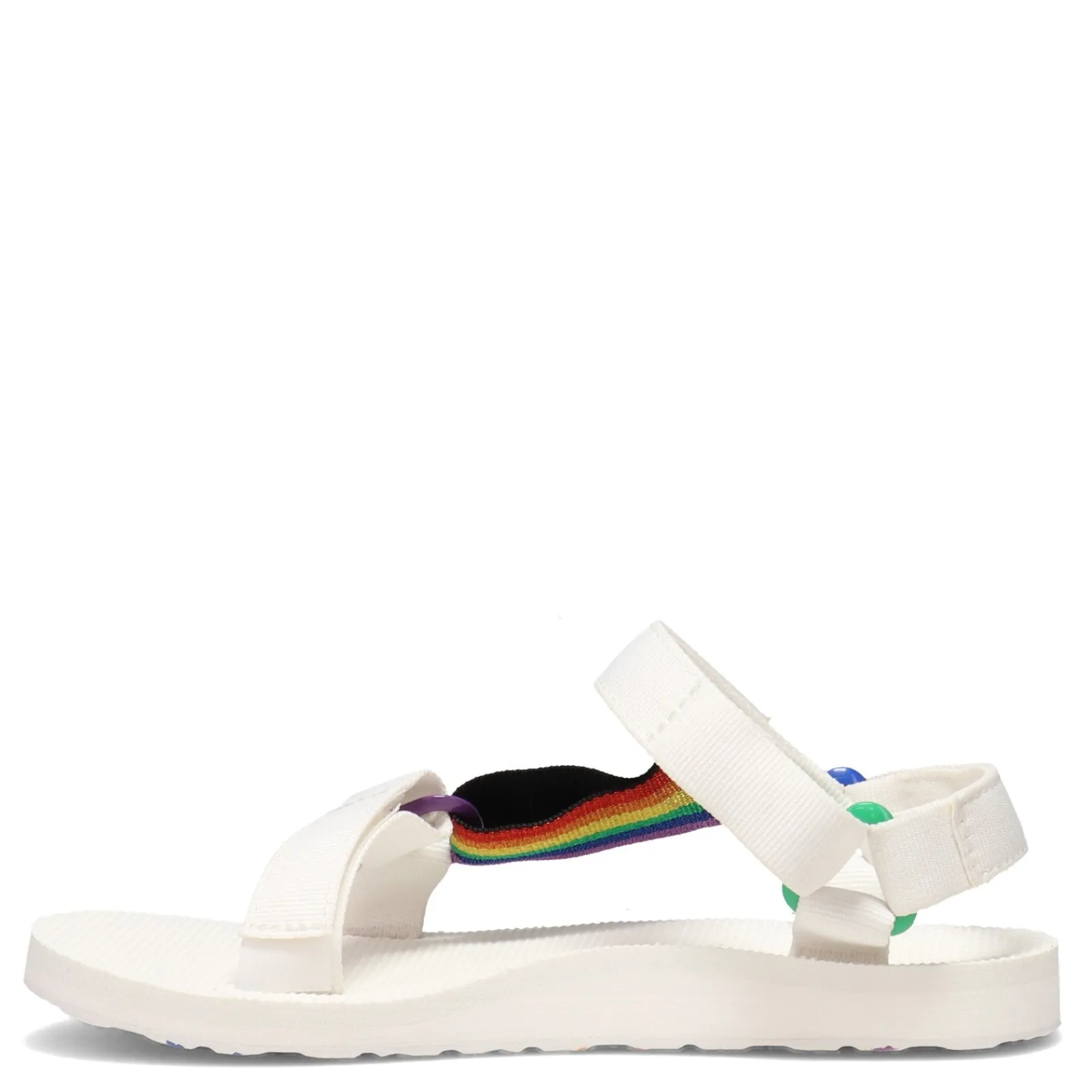 Women’s Teva, Original Universal Pride Sandal. You’ll love the colorful rainbow colors of this special edition of the Universal Sandal. The quick-drying straps are made from 100% recycled plastic using traceable REPREVE polyester yarn by Unifi, so you’ll feel good about wearing them.